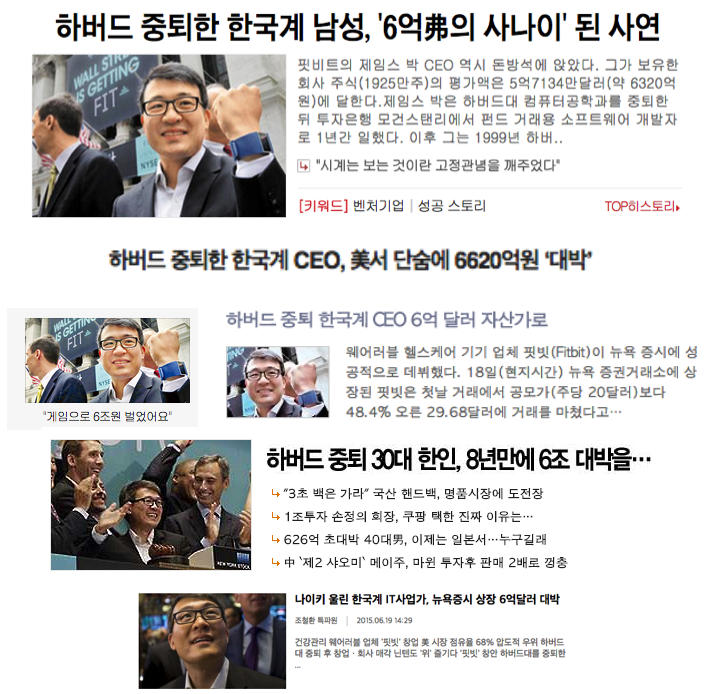 그런데 핏빗의 상장이 미국에서는 화제가 될만한 중요한 IPO이긴 하지만 한국에서는 그렇게 잘 알려진 회사의 뉴스는 아니다. 한국의 대중들이 매일처럼 쓰는 인터넷SNS를 제공하는 회사도 아니기 때문에 보통은 이런 회사의 상장소식이 일간지에 크게 나오는 경우는 드물다. 보통은 경제신문의 국제면 정도에 나온다. 하지만 이번에는 각 종합일간지에서 제법 크게 소개됐다. 창업자인 제임스 박이 한국계이기 때문인 것 같다. 그런데 온라인에 실린 주요신문의 이 기사 제목을 보면서 또 어떤 패턴을 읽게 됐다.