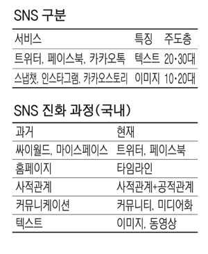 23일 미국 BI인텔리전스 등 시장조사 전문기관에 따르면 10·20대를 중심으로 스냅챗, 인스타그램 등 이미지·동영상 중심 SNS가 급부상하고 있다. 대중적으로는 페이스북·트위터, 한국에선 카카오스토리 등이 인기를 끌고 있지만 계층과 연령, 성별을 따져보면 세분화되고 있다는 것이다.