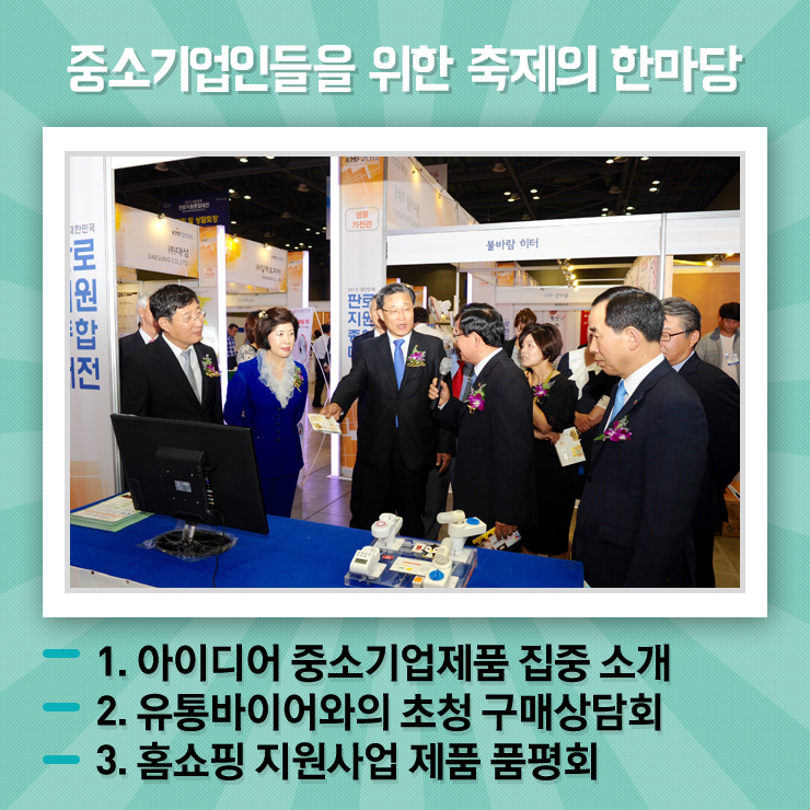 이 외에도 중소기업 판로유공자 시상식, 중소기업 지원사업 상담관 및 홈쇼핑 지원사업 제품 품평회 등 다양한 부대행사를 통하여 중소기업인들을 위한 축제의 장이 되었습니다.