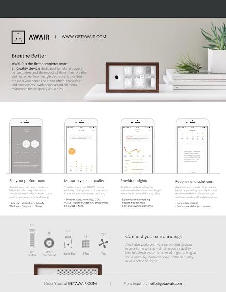 스타트업 비트파인더가 내놓은 ‘어웨어(Awair)’는 사물 인터넷(IoT) 기술이 적용된 소비자 맞춤형 공기서비스 디바이스로 공기 상태를 모니터링하고 맞춤형 해결책을 제시한다. 작동원리는 어웨어 내부에 장착된 센서가 실내 온도, 습도, 이산화탄소, 미세 먼지, 화학물질 등을 측정하고, 사용자는 모바일 앱을 통해 측정된 정보를 확인할 수 있다.