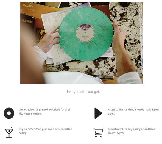 –Vinyl Me, Please는 음악과 아트, 술의 조합을 바탕으로매니아층을 형성하며 서비스를 확대해가는 중에 있음. 최신 곡과 인기 곡에 국한되지 않고 다양한 시대의 음악과 각 장르별 음악을 골고루 섭렵할 수 있다는 점에서 즐거움을 제공함. 함께 제공되는 앨범 아트와 칵테일 레시피는 음악을 더욱 풍성하게 경험할 수 있도록 해 줌