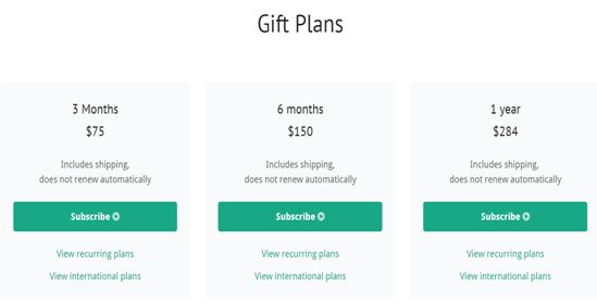 – 캐나다를 포함하여, 미국 이외의 지역으로도 박스를 배송하고 있음. 월 이용료는 서비스 이용 국가별/가입 기간별로 구분되어 적용됨