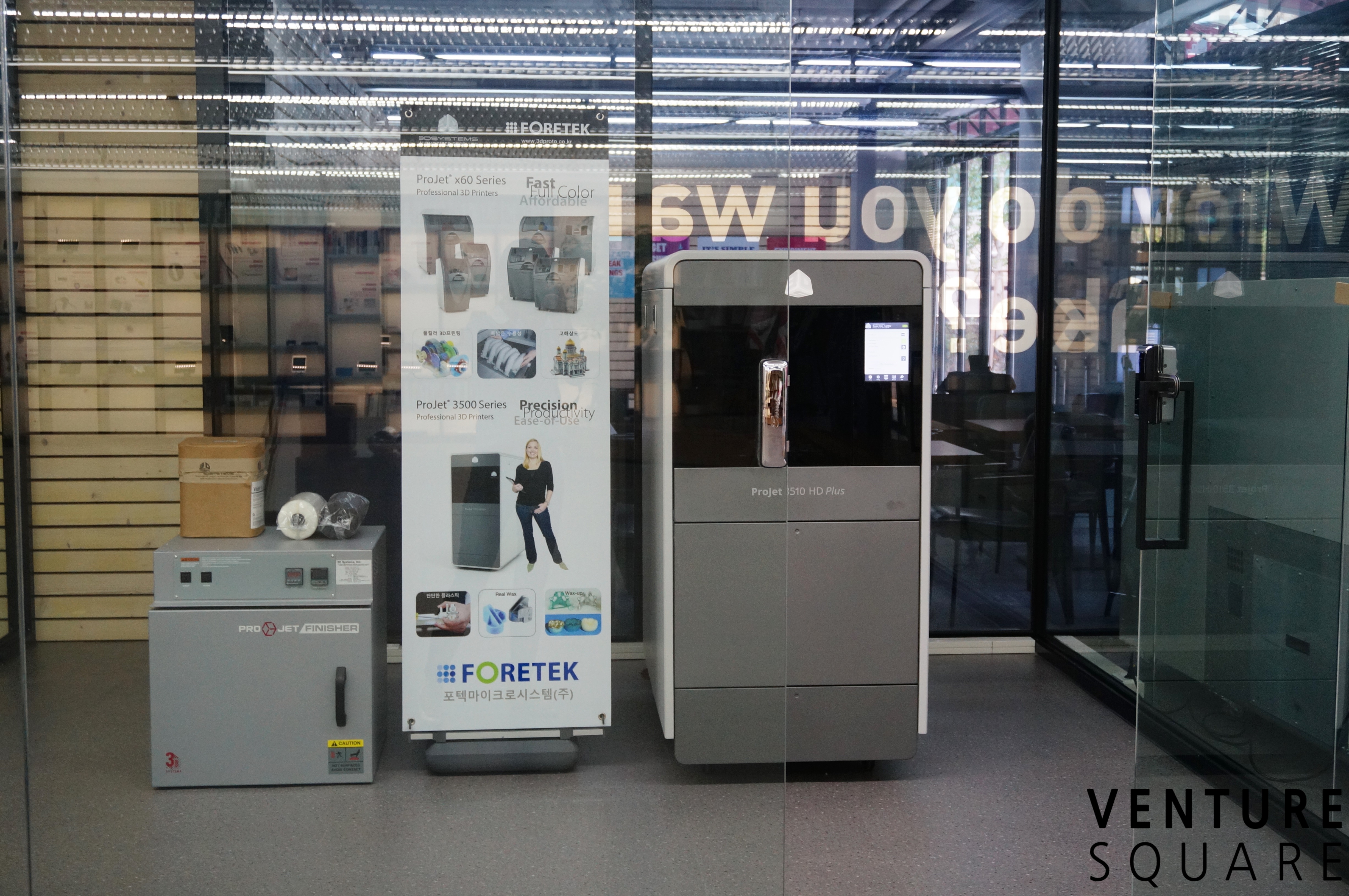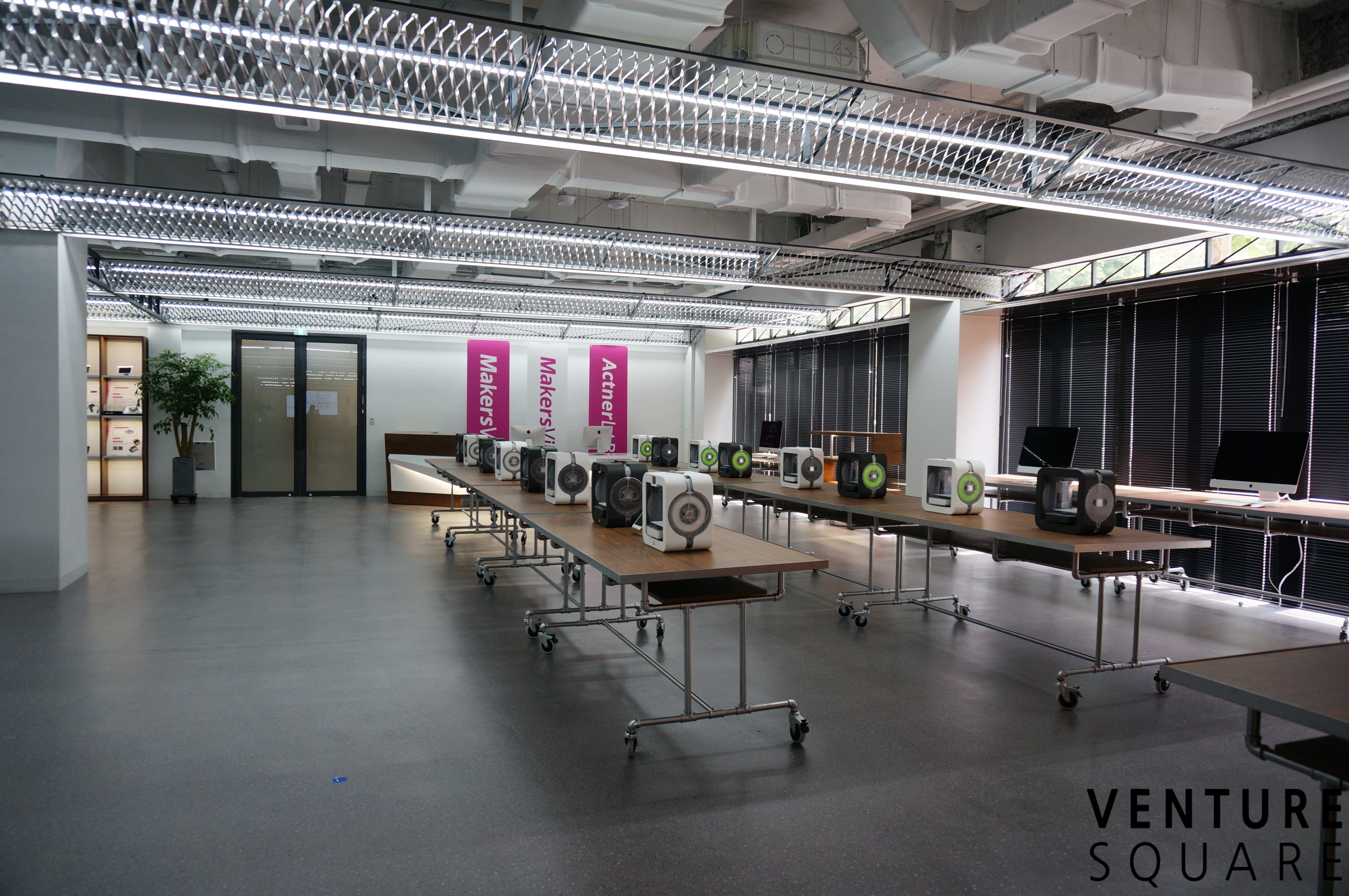 스파크룸의 오렌지 색 유리문을 지나면 하드웨어 엑셀러레이터인 액트너랩이 운영하는 메이커스빌이 있습니다. 메인 홀에는 교육용 3D 프린터들이 나열돼있네요. 3D 프린터들은 모든 일반인이 이용할 수 있습니다. 아직 사용료는 미정이고, 8월 초부터 일반인들에게 오픈될 예정입니다.