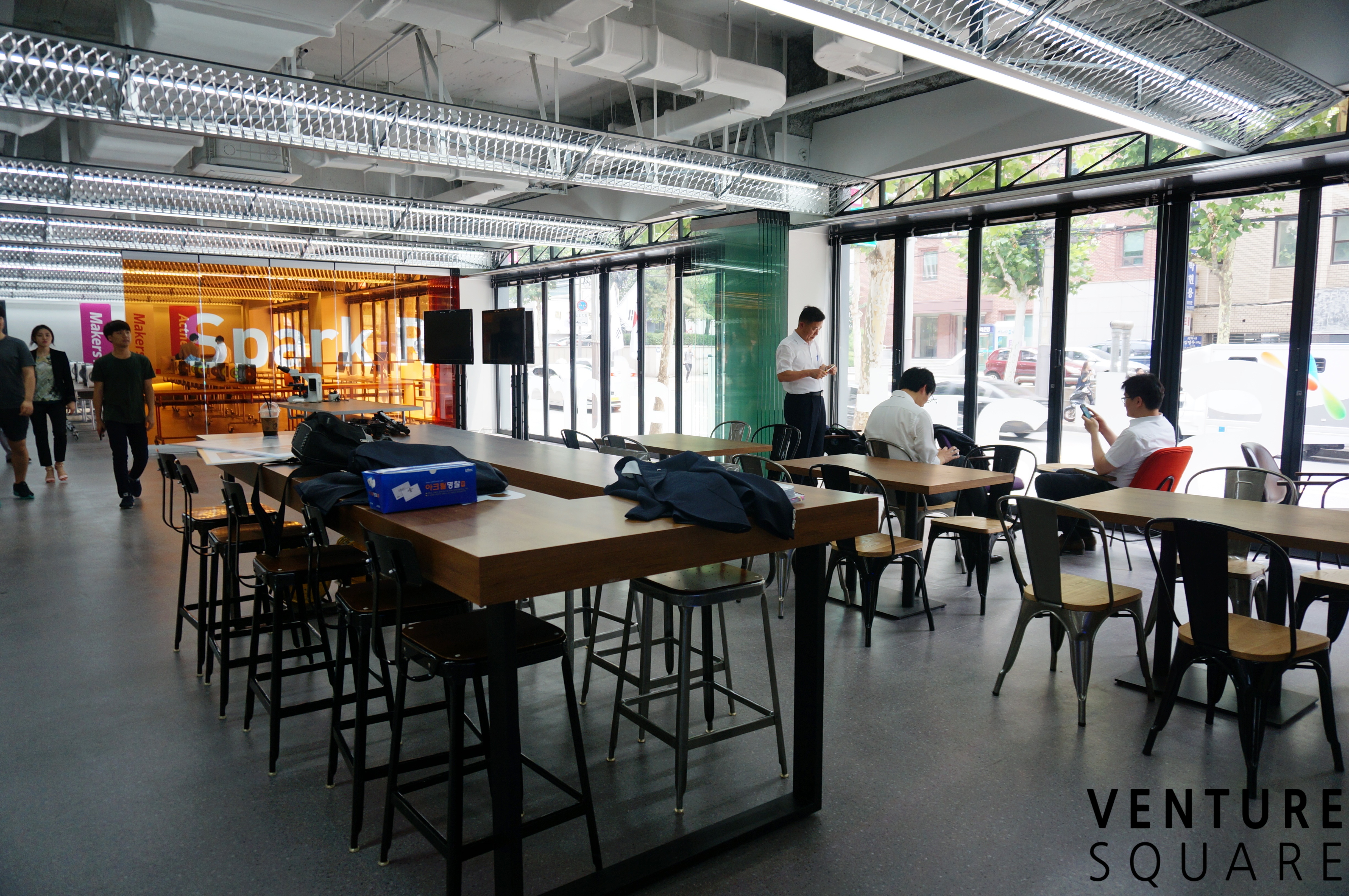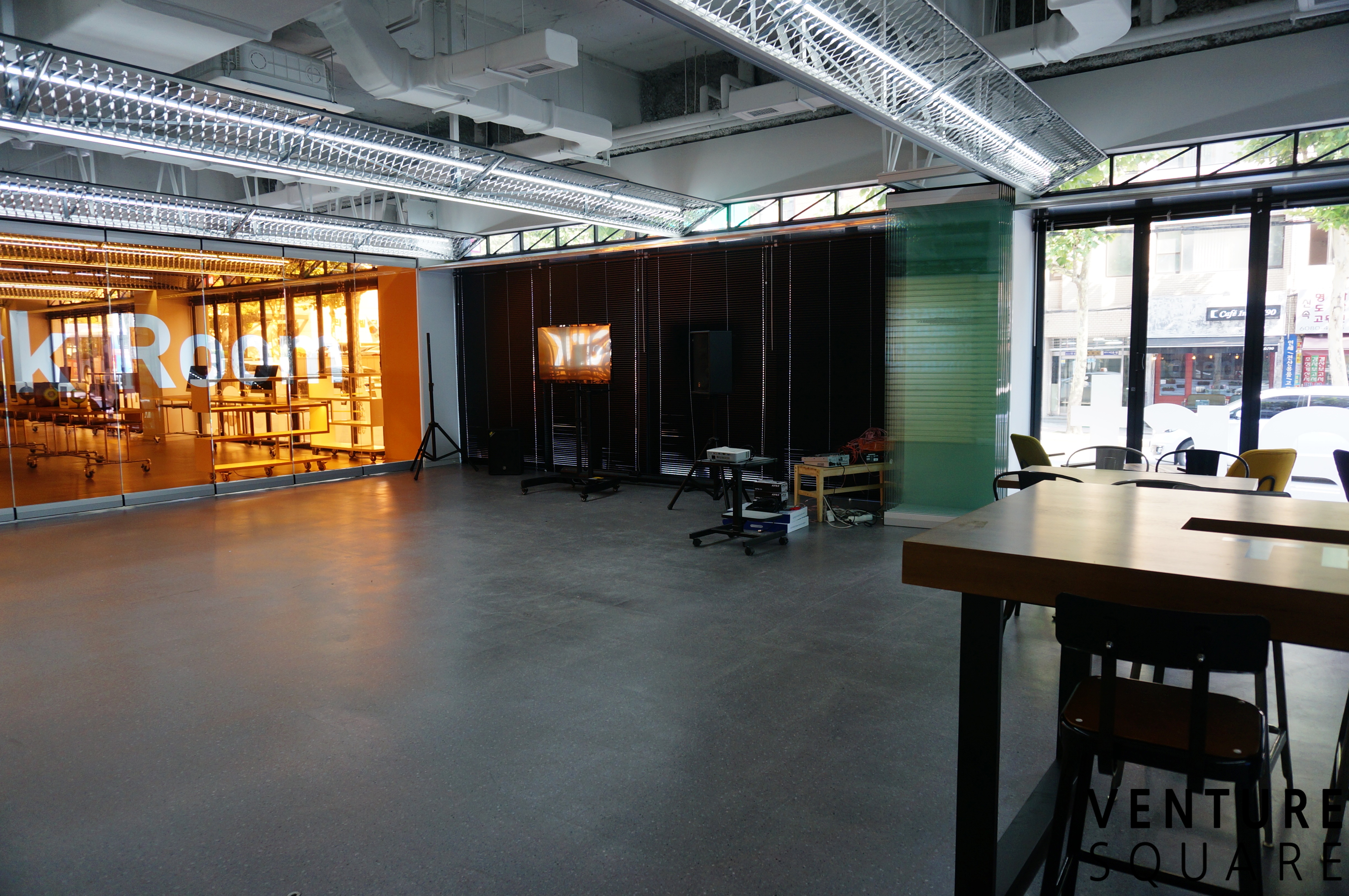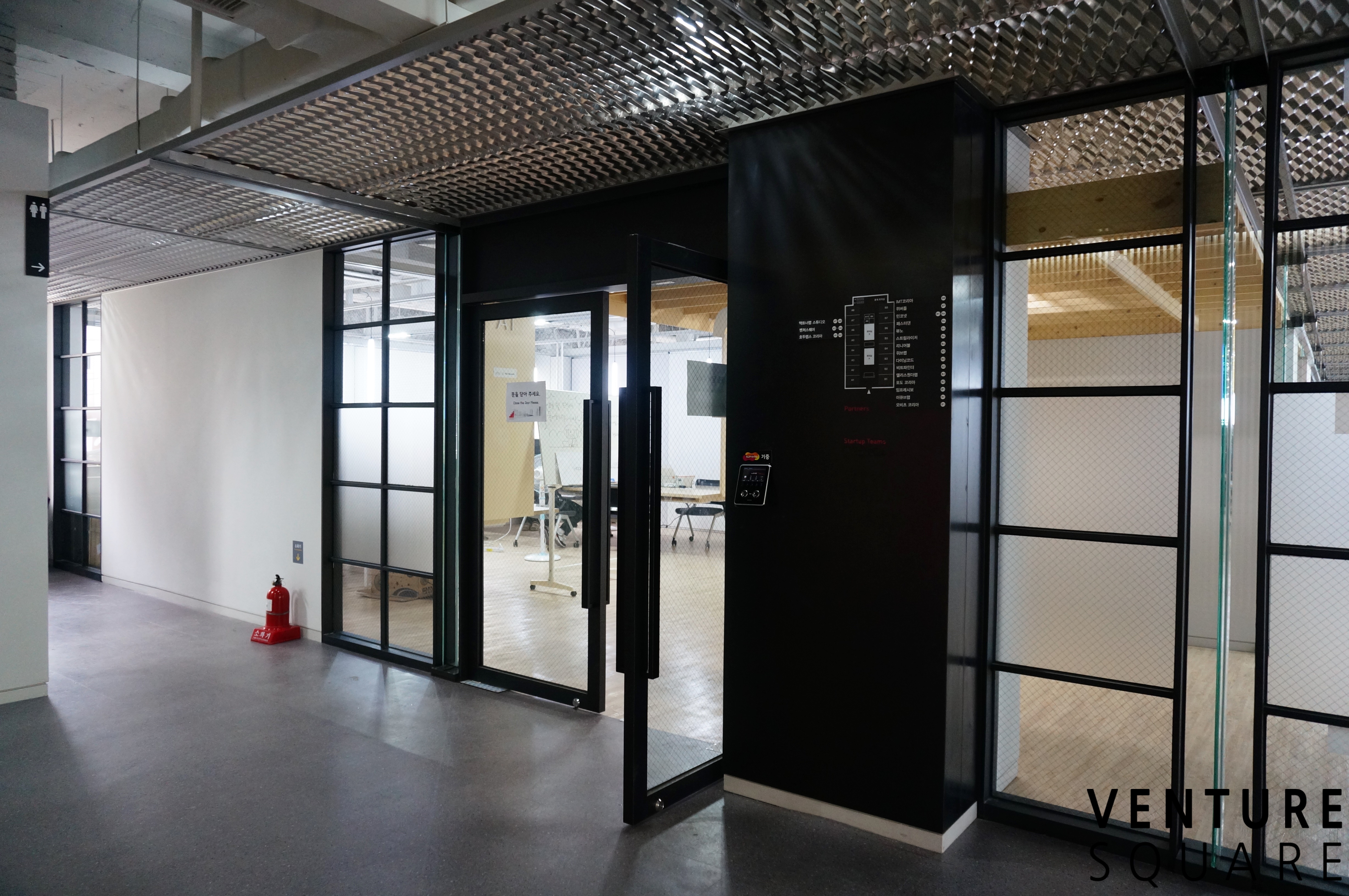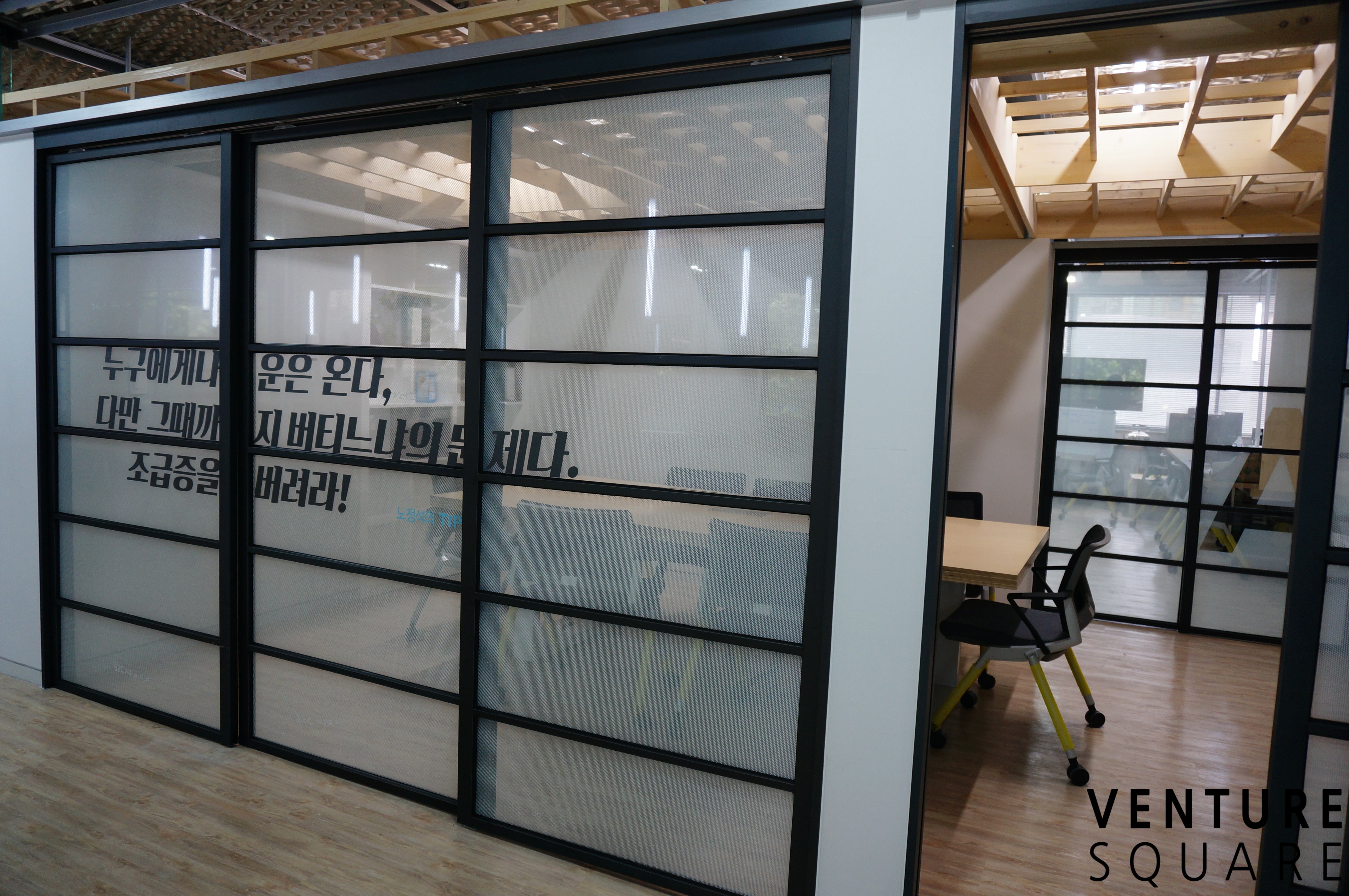스타트업 스퀘어와 연결되어 있는 스파크룸입니다. 중간 유리문을 닫으면 독립적인 공간으로 사용할 수 있습니다. 이 공간 역시 벤처스퀘어가 운영합니다.