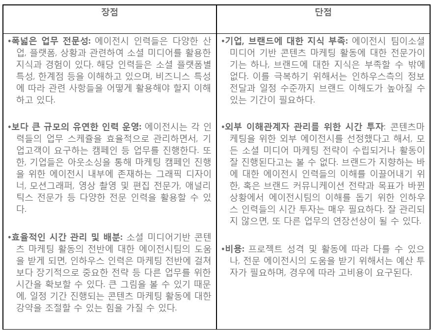 소셜 미디어 기반 콘텐츠 마케팅 비즈니스 미팅을 하다 보면, 가끔씩 접하게 되는 질문이 있다. 관련 마케팅 활동은 인하우스팀(기업 내부) 멤버들을 통해 진행하는 것이 맞는가? 아니면 전문회사 즉 아웃소싱을 통해 지원을 받는 것이 적합한가?