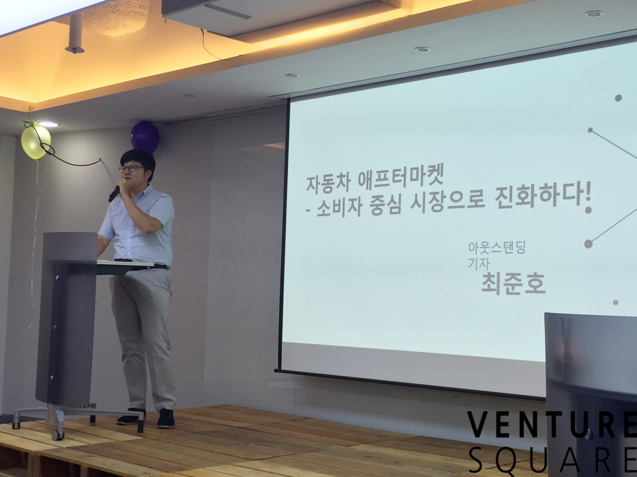 이후 첫 번째 발표를 맡은 아웃스탠딩 최준호 기자는 사람이 아프면 그 때마다 병원에 가진 않지만 자동차는 작은 흠집만 생겨도 바로 고치고 싶어하는 소비자 심리를 지적하며 자동차 애프터 마켓이 더 커질 수 있는 가능성에 대해 설명했다. 더불어 자동차는 이미 규모가 큰 시장, 자동차 애프터 마켓 전반적으로 퍼져있는 소비자 불신, 높은 중간 수수료, 미래 ‘먹거리’로 투자 유치에 매력적인 점을 근거로 향후 자동차 관련 시장의 성장을 전망했다.