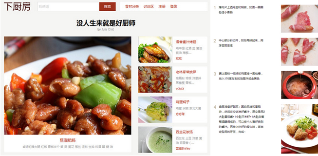 * 각 레시피에 대한 사용자들의 코멘트 및 평가 점수, 이용률이 게재되어 있고, 사용자는 완성된 음식 사진을 올릴 수도 있음. 또한 Xiachufang은 사용자가 선택한 레시피에 기반해 관심 있어할 만한 다른 레시피도 추천해줌
