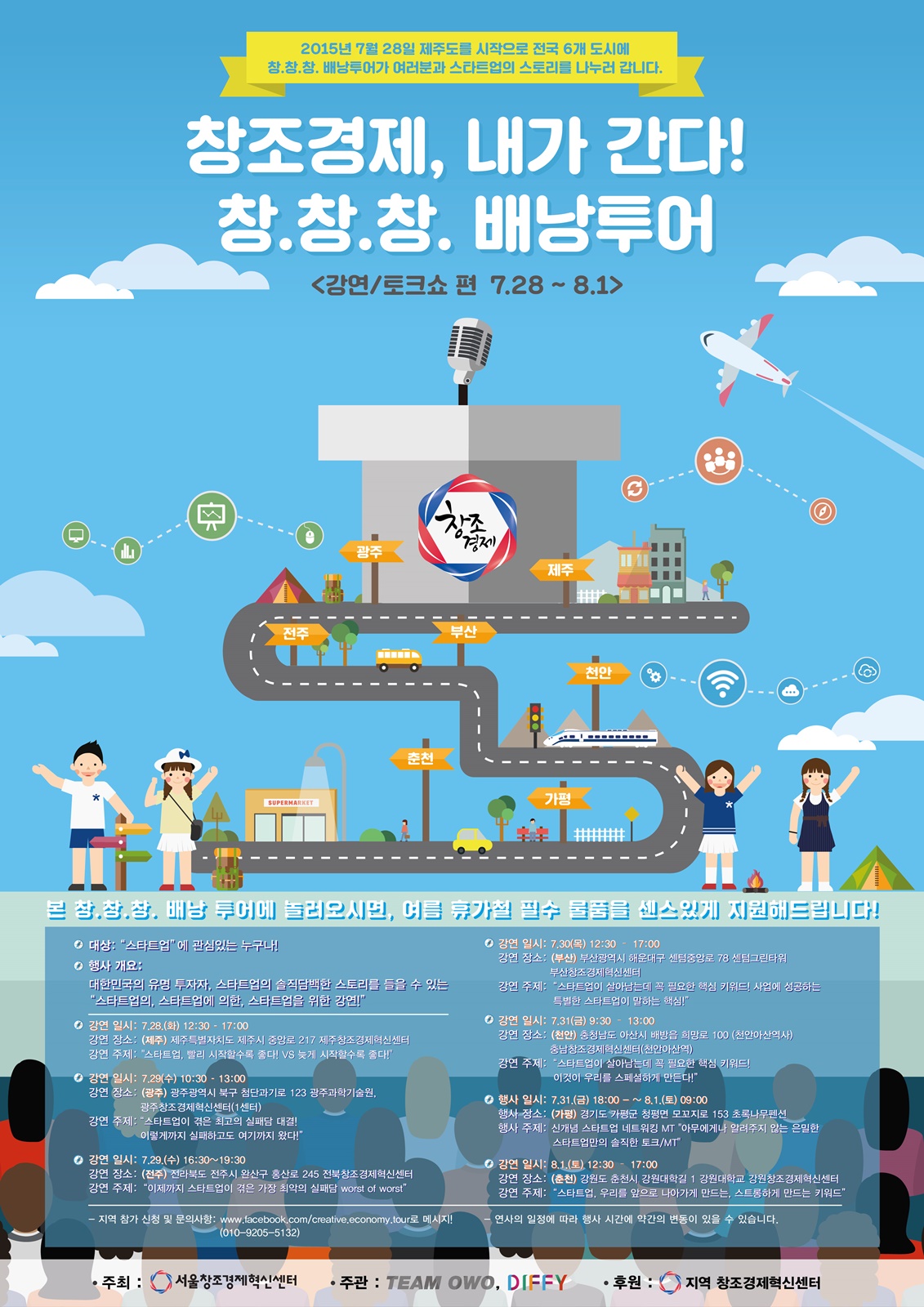 서울창조경제혁신센터는 ‘엠티를 부탁해’ 서비스를 운영하는 스타트업 오더블유오(OWO)와 함께 창업가, 예비 창업가 등 스타트업에 관심있는 사람들에게 국내 유명 투자자와 스타트업의 이야기를 들을 수 있는 시간을 마련하고, 스타트업 간 네트워킹의 장을 마련하기 위해 오는 28일 제주도를 시작으로 전국 6개 도시에 5일 간 강연과 토크쇼 투어를 시작한다.