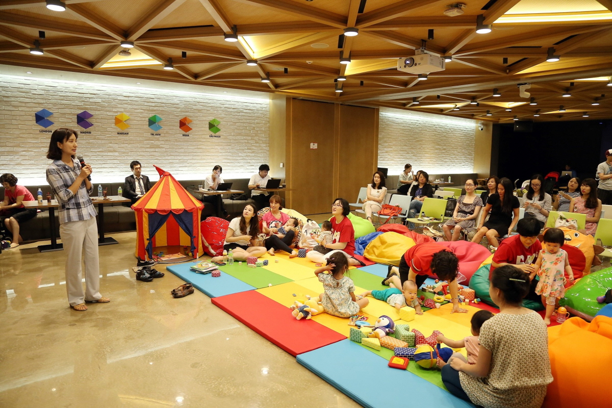 아기와 함께하는 창업 지원 프로그램 ‘엄마를 위한 캠퍼스’는 부모 창업가들이 스타트업 커뮤니티와 교류하고, 세상을 바꿀 수 있는 회사를 만들 수 있도록 지원하는 것을 목표로 하고 있다. 특히, 보육 시설에 맡기기 어려운 18개월 미만의 아기와 엄마가 함께 수업을 들을 수 있도록 강의실에는 아기 돌봄 서비스와 함께 아기들이 기어 다니며 놀 수 있는 푹신한 매트와 장난감이 제공된다.