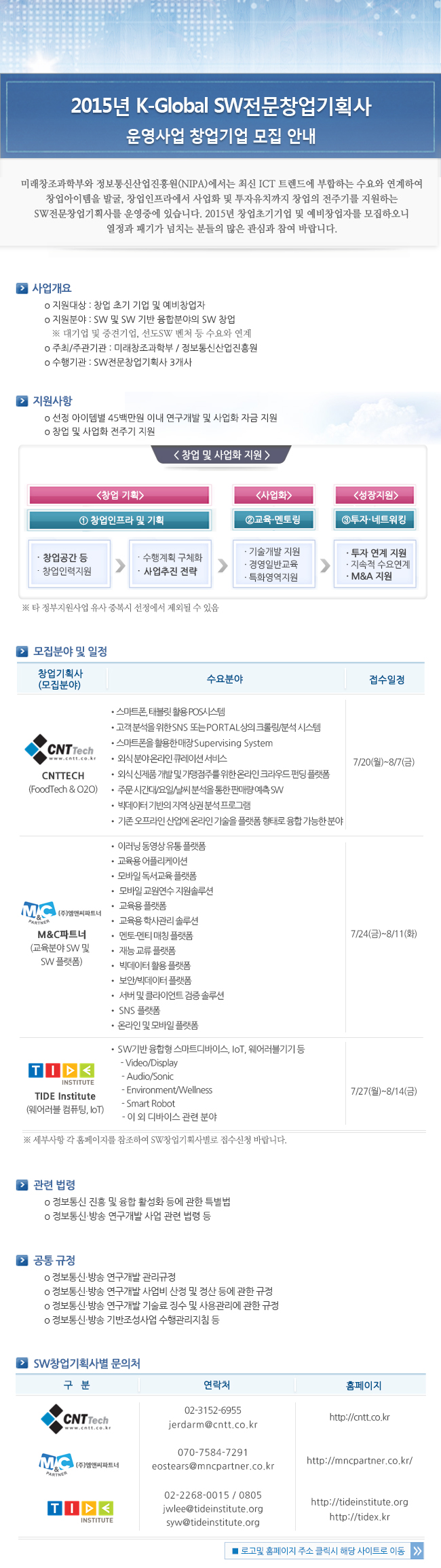 SW 전문 창업 기획사는 미래창조과학부가 정보통신산업진흥원(NIPA)와 함께 최신 ICT트렌드에 맞는 창업 아이템을 발굴하고 사업화와 투자 유치까지 지원하는 기업을 선정해 지원하는 사업으로 이번에 선정된 SW전문 창업 기획사 3개 사는 CNT테크, 엠앤씨파트너, 타이드 인스티튜트(TIDE Institute)다. 이 3사는 각 기업별로 관심 분야의 스타트업, 예비 창업가를 선발해 아이템별 4천 5백만원 이내의 연구 개발과 사업화 자금을 지원하고, 창업 및 사업화 전 주기를 지원한다. 특히 창업 기획 / 사업화 / 성장 지원 등 단계별로 창업 인프라 및 기획 교육 / 멘토링 / 투자 네트워킹을 지원할 예정이다.