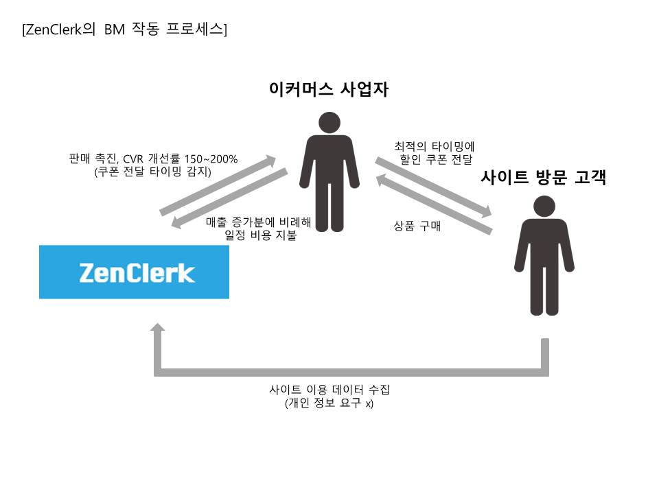 – 오프라인 매장과 달리, 온라인 상에서는 각 소비자들에 대한 실시간 대응이 쉽지 않음. ZenClerk는 소비자가 이커머스 사이트에 방문한 순간부터 보이는 모든 행동을 분석하여 어떤 상품을 구매하고자 하는지 파악해냄. 매장 직원이 다가가 말을 건네듯이, 소비자가 가장 필요로 하는 순간에 맞춤 할인 쿠폰을 제시함으로써 상품 구매를 유도함