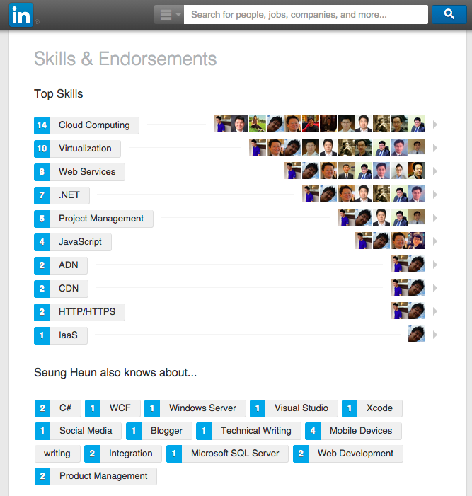 링크드인은 전문가들의 네트워크를 지향하는 서비스이기 때문에 각 개인이 등록한 기술과 지식 등을 어떻게 평가할 것이냐가 중요한 관건입니다. 때문에 사용자가 링크드인에 전문 분야나 기술을 등록하면 이들 개개의 기술 혹은 분야에 대해서 지인들이 평가를 하고 추천을 할 수 있는 시스템이 무척 잘 되어 있습니다.