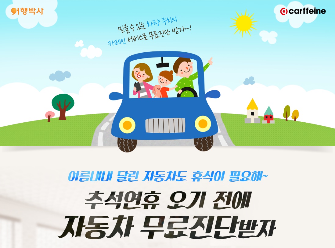 자동차 종합관리 서비스 카페인을 운영하는 카페인모터큐브가 종합 여행사 여행박사와 함께 자동차 무료 정밀 진단 서비스를 제공하는 ‘추석연휴 오기 전에 자동차 무료진단 받자’ 이벤트를 진행한다.