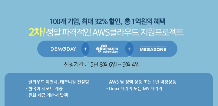 ‘정말 파격적인 AWS 클라우드 지원 프로젝트’는 클라우드를 도입하거나 IDC에서 클라우드로 전환하고자 하는 스타트업에게 특화된 아마존 클라우드 전용상품을 32% 할인해 주고, 한국어 서포트, 원화빌링서비스, 테크니컬 컨설팅 등을 제공하는 프로모션으로 6일부터 한 달간 100개 기업을 대상으로 추가로 선착순 신청을 받는다. 신청은 데모데이 홈페이지(http://www.demoday.co.kr) 에서 하면 된다.