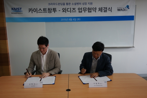 펀딩포털 와디즈가 카이스트청년창업투자지주와 MOU를 체결하고 크라우드펀딩을 통한 소셜벤처의 지속 성장을 도모한다.