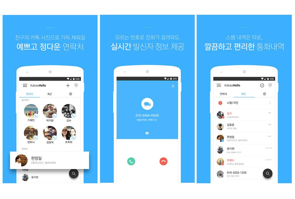다음카카오는 스팸 차단, 연락처 관리 등 스마트폰 전화통화를 위한 편의 기능을 하나로 모은 통합 전화앱 ‘카카오헬로’의 오픈 베타 테스터를 모집한다고 11일 밝혔다. 테스트 버전으로 선보인  ‘카카오헬로’는 안드로이드 스마트폰에서만 사용할 수 있다.