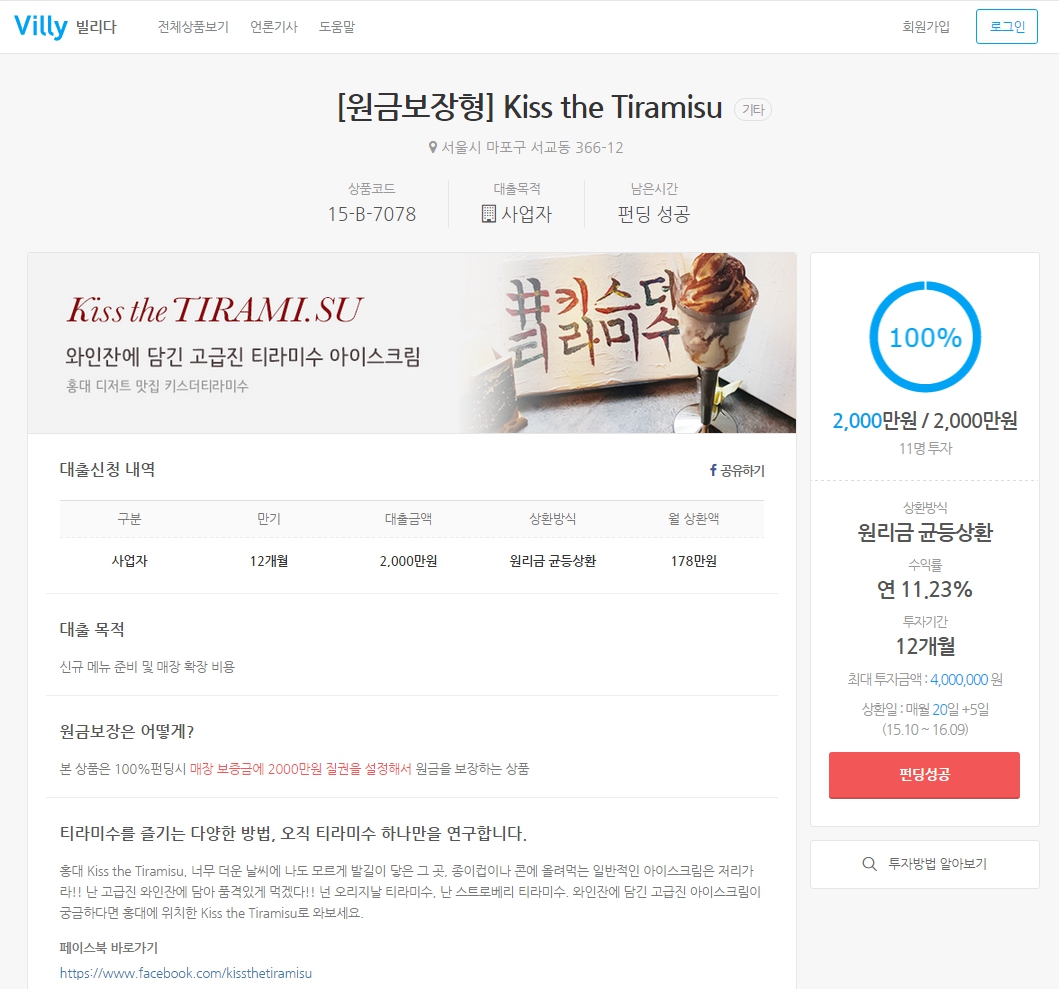 온라인 P2P 대출형 크라우드펀딩 플랫폼 빌리가 오픈한 두번째 기업 딜 ‘키스더티라미수(Kiss the Tiramisu)’ 가 4시간 만에 성공했다.