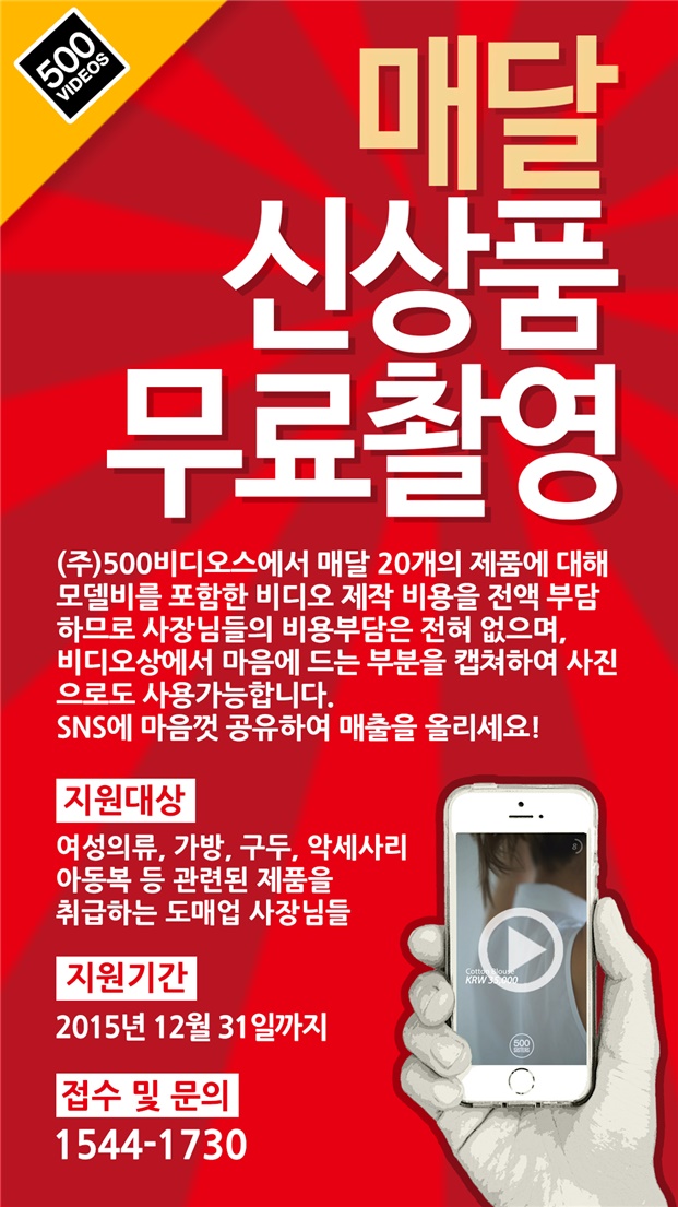 이번 프로젝트의 우선지원 대상은 동대문 지역의 소상공인들이며 점차 지원 대상을 확대할 예정이다. 업체당 매월 20개 아이템을 무료 촬영해 제공하며, 모델료를 포함한 비디오 제작비용은 500비디오스에서 전액 부담해 소상공인 비용 부담은 전혀 없다.