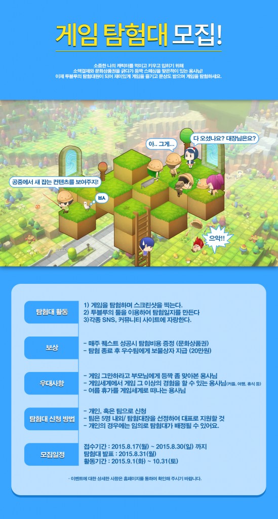 이번에 선발하는 ‘이 세상의 모든 게임, 탐험대’는 게임의 세계를 탐험하고, 탐험을 하면서 일어난 에피소드들을 스크린샷으로 촬영하여 투블루의 툴로 탐험일지를 제작하고 공유하게 된다. 메이플스토리2, 마비노기, 마비노기 영웅전, 마인크래프트, 아이온 등 평소에 즐겨 하던 게임이 있다면 지원이 가능하다.