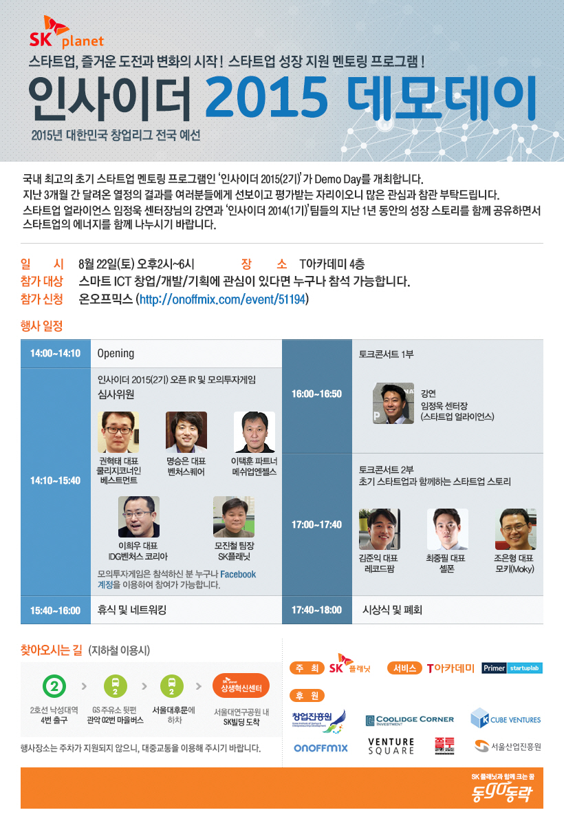 SK플래닛은 국내 스타트업 교육 및 멘토링 프로그램 SK 플래닛 인사이더(Insider) 2015’의 데모데이를 오는 22일에 개최한다고 밝혔다.