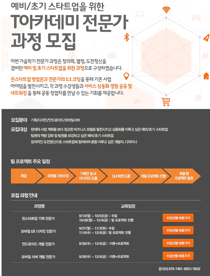 T아카데미 전문가 과정은 일방적인 강의만을 제공하는 것이 아닌 린스타트업 방법론과 국내 최고 전문가의 강의와 코칭을 통해 개인의 아이디어를 발전시킬 수 있는 능력을 기를 수 있다. 또 팀 프로젝트를 통한 협업(Co-work)을 바탕으로 같은 목표를 가진 팀원을 찾아 실제 상용화 할 수 있는 기회를 제공한다. 강의, 프로젝트, 네트워킹으로 이어지는 프로그램 구성을 통해 참가자는 실제 사업에서 발생할 수 있는 수많은 시행착오를 줄일 수 있을 뿐 아니라, 아이템의 상품성을 극대화할 수 있다.