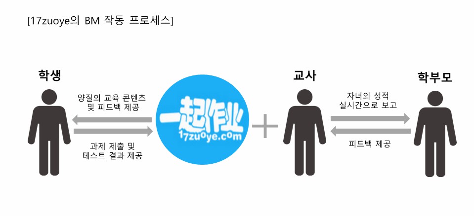 – 중국은 현재 유치원에서 고3까지 학교에 재학 중인 학생 수가 2억 명에 달하며, 가계 소득의 40%를 교육에 투자할 정도로 교육열이 높음. 특히 영어 교육에 대한 열기가 높아지면서 이를 타깃으로 한 스타트업들의 성장이 가속화되고 있음. 17zuoye는 교사가 아이들의 학업능력을 일일이 체크하고 학습 과정에 대한 세분화된 데이터를 측정하여 부모에게 실시간으로 보고하는 등 ‘학생-교사-부모 간의 소통’을 강화하였음