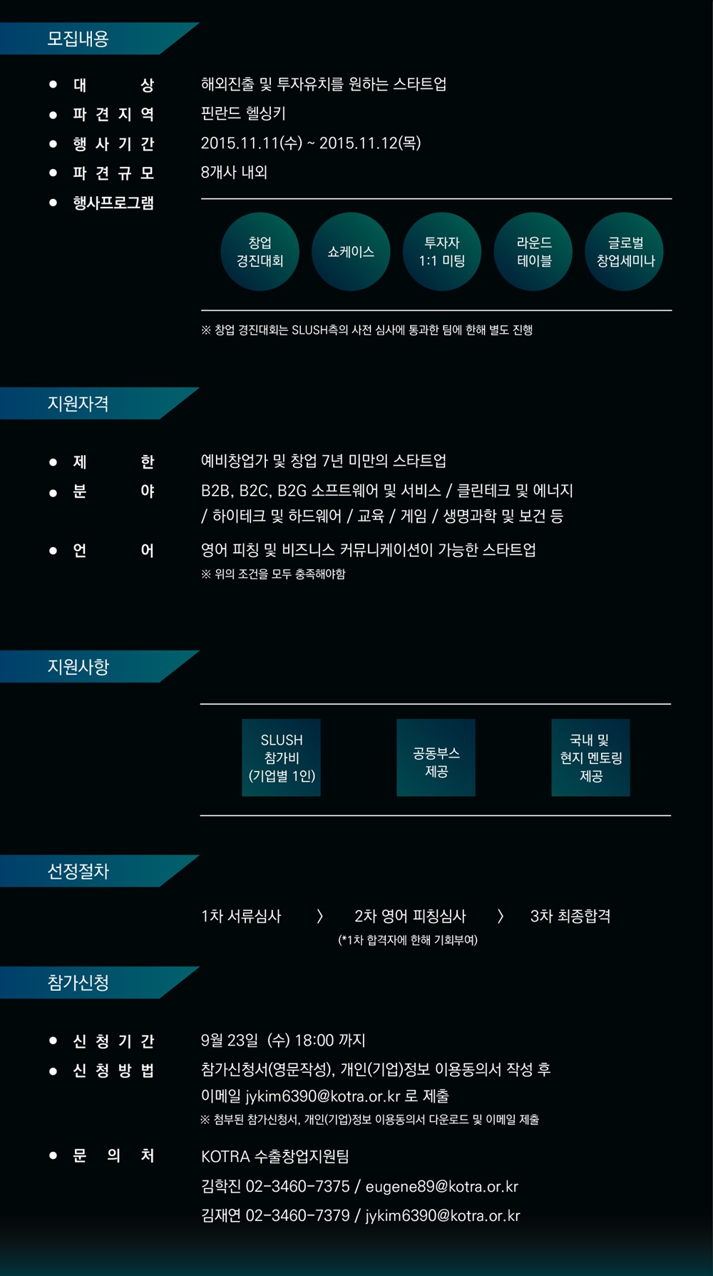 이번 SLUSH 2015는 11월 11일부터 12일까지 양일간 핀란드 헬싱키에서 개최될 예정이며, 참가 지원자격은 해외진출 및 투자유치를 원하는 7년 미만 스타트업이자 B2B, B2C, B2G 소프트웨어 및 서비스, 클린테크 및 에너지, 하이테크 및 하드웨어, 교육, 게임, 생명과학 및 보건 등의 분야, 영어 피칭 및 비즈니스 커뮤니케이션이 가능한 스타트업이다.