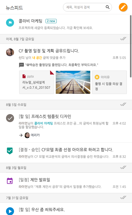 콜라비팀은 ‘뉴스피드’를 통해 동료들이 공유한 파일 뿐만 아니라, 할 일, 의사결정, 그리고 그에 대한 커뮤니케이션 히스토리까지 필요한 정보를 한 눈에 볼 수 있는 협업도구 ‘콜라비’를 출시했다.