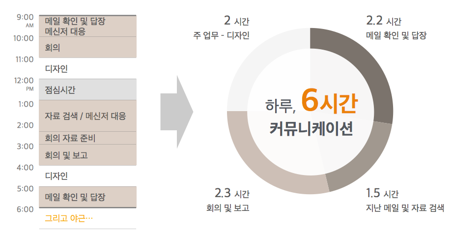 Mckinsey와 한국생산성본부의 자료에 의하면 지식근로자들의 하루 8시간 근무 시간 중, 약 6시간 가량을 자료검색과 커뮤니케이션에 소요하는 것으로 나타났다. 실제로 많은 직장인들은 메일과 메신저로 커뮤니케이션 하거나 자료를 찾는데 많은 시간을 할애하고 있었으며, 이로인해 본 업무를 할 수 있는 시간이 적어 야근을 할 수 밖에 없다고 토로했다.
