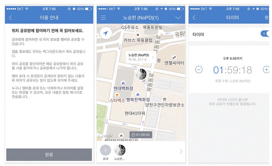 위치 공유방에 있다가 위치를 알리지 않기 위해 무조건 위치 공유 방을 나가는 것은 사용자 입장에서 보면 왠지 불편한 것이 될수도 있습니다. 때문에 사용자들은 각 위치 공유 방에서 위치를 공유할 시간을 설정할 수 있고 그 외의 시간에는 위치 공유 방에 있더라도 위치가 친구들에게 공유되지 않도록 함으로써 어느정도의 프라이버시를 지킬 수 있는 여지를 제공하고 있기도 합니다.