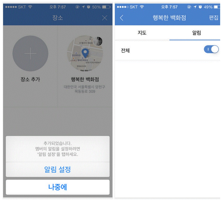 친구들과 위치 정보를 공유하고 있다고 해서 항상 히어 앱만을 들여다 보고 있을 순 없겠죠? 모임의 장소와 시간이 정해졌고 필요한 멤버들을 위치 공유 방을 만들어 모아 두었다면 간단히 알람을 설정하여 모임 장소 근처에 도착한 친구들을 쉽게 식별할 수 있게 됩니다. 왠지 이제는 더이상 “어, 지금 거의다 왔어!” 하는 말을 메신저 창이나 전화상으로 할 수 없게 될 것 같은 불안한 예감도 드네요!