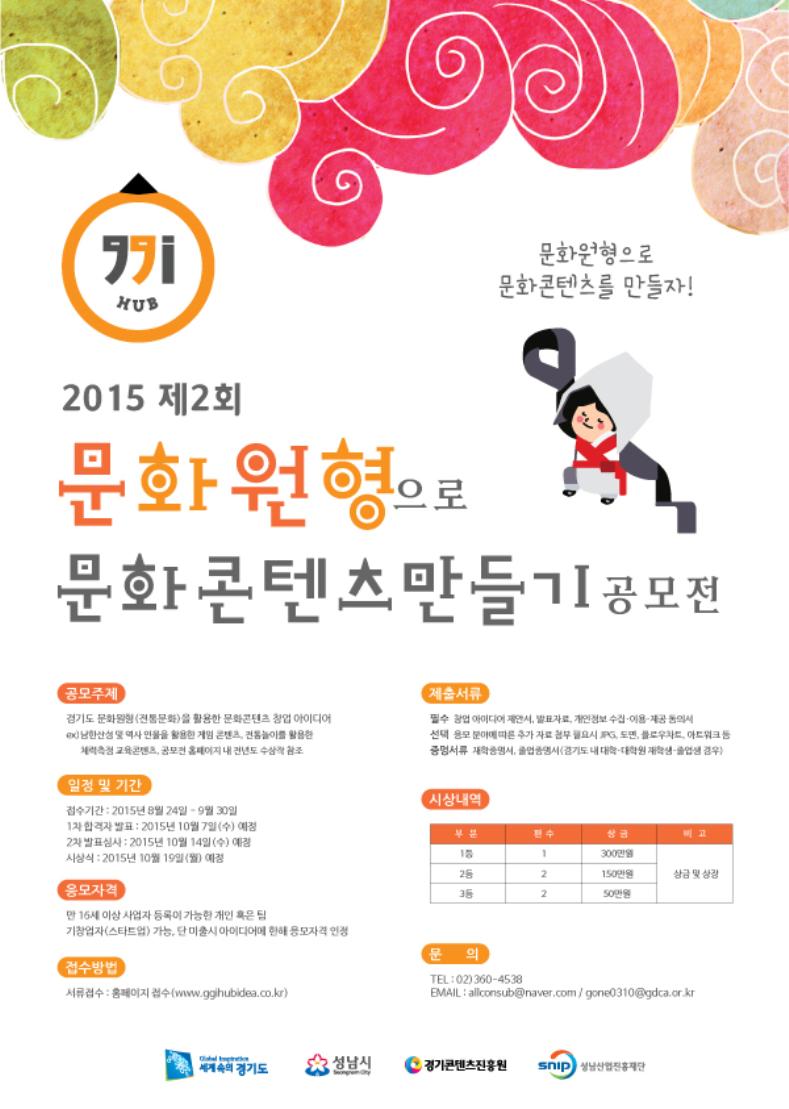 경기도는 문화원형을 활용한 콘텐츠 창업 활성화를 위해 ‘2015 제2회 문화원형으로 문화콘텐츠 만들기 공모전’ 접수를 오는 9월 30일까지 진행한다고 밝혔다.