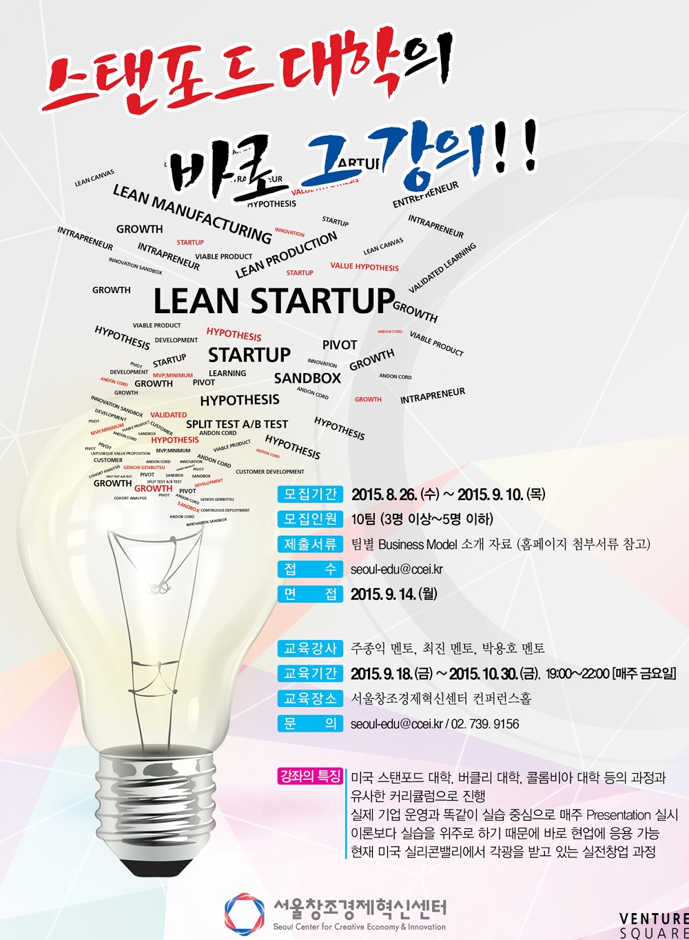 서울창조혁신센터가 실전창업교육 ‘린스타트업’ 의 세 번째 교육생을 모집한다. 린스타트업은 미국 스탠포드 대학의 실전 창업 강의 커리큘럼에서 모티브를 따와 한국 스타트업 환경에 맞게 변형한 실무 위주의 교육으로 오는 9월 18일부터 10월 30일까지 매주 금요일 저녁 7시 광화문에 위치한 서울창조혁신센터에서 진행될 예정이다.