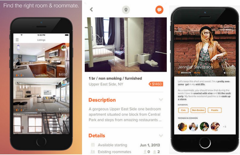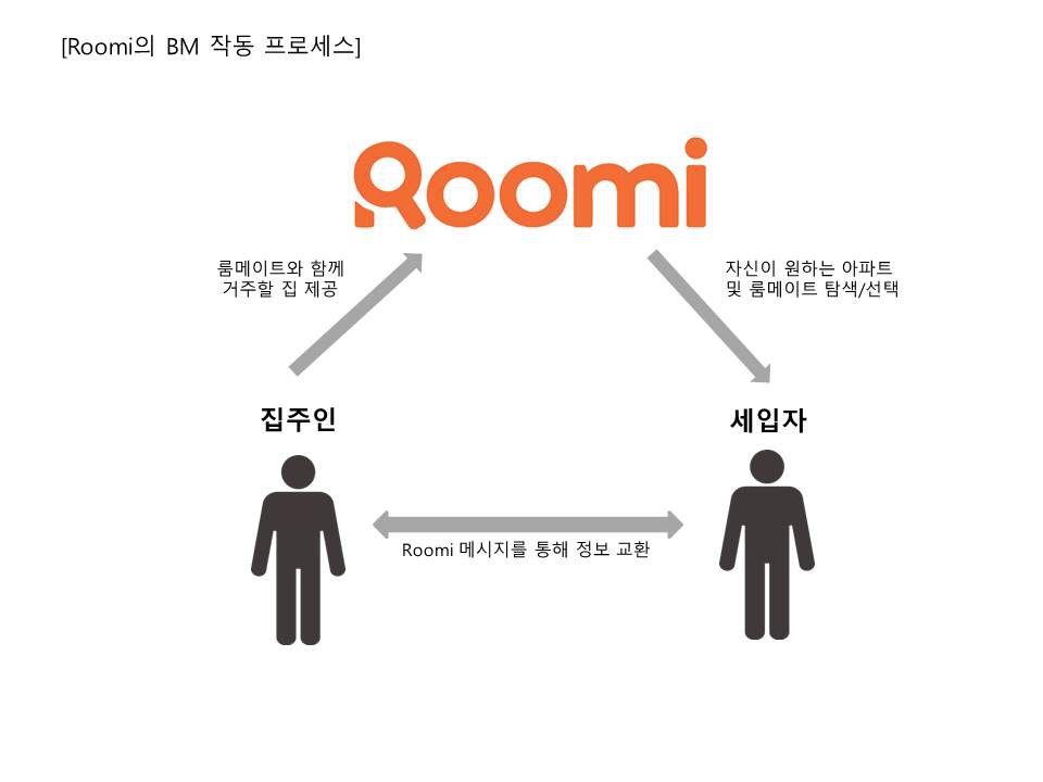 3.    서비스 내용(iOS, Web): 룸메이트를 구하고자 하는 사용자와 주거할 집을 구하는 사용자를 중개해주는 부동산 앱. 룸메이트를 원하는 집주인들이 간략한 자기 소개와 함께 아파트에 대한 정보 및 사진을 Roomi앱에 게시하면, 집을 구하려는 세입자들은 여러 가지 조건 등을 고려해 자신에게 맞는 집과 룸메이트를 구할 수 있음. 또한 Roomi는 앱 내 메시징 기능을 내장해, 집주인과 세입자가 문자를 통해 동거 조건, 지켜야 할 사항, 집 보러 가는 일정 등을 미리 상의할 수 있도록 함