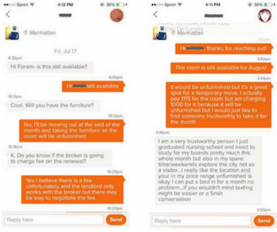 – 집주인과 해당 집에서 거주하고 싶은 사용자는 Roomi앱 내 장착된 메시징 기능을 이용해 방문할 날짜, 세부적인 계약 조건 등을 조정할 수 있음