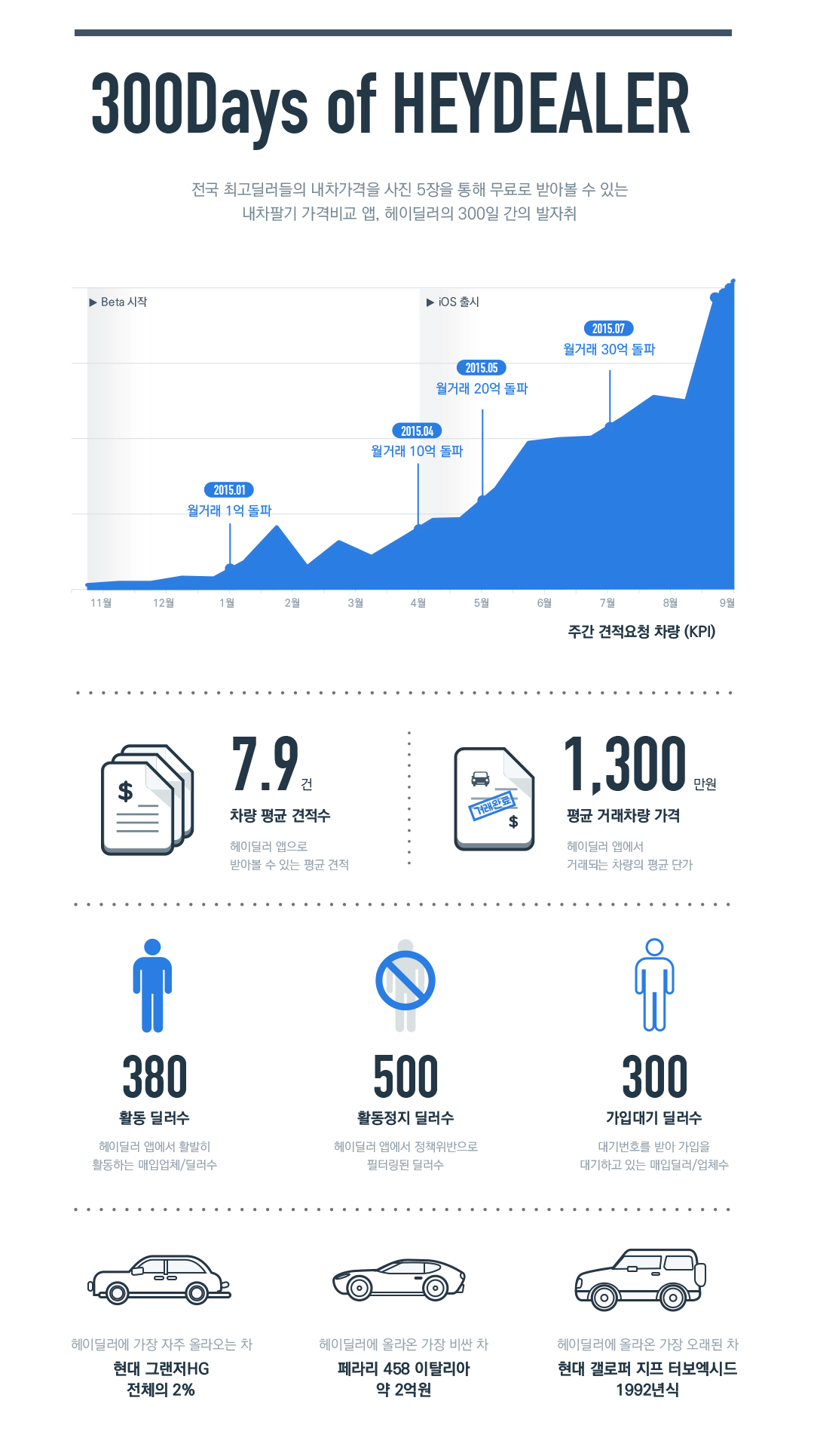 중고차 판매 가격비교 어플리케이션 ‘헤이딜러’가 누적 거래액 100억원을 돌파했다고 밝혔다. 2014년 11월 첫 서비스를 시작한 헤이딜러는 지난 8월까지의 거래 금액을 합산한 결과 누적 거래금액이 100억원을 넘어섰다. 특히 누적 거래금액 10억원 돌파에는 6개월이 걸렸으나 2개월 뒤 50억원을 돌파했고 다시 2개월 뒤 100억원을 돌파하며 성장세를 이어가고 있다.