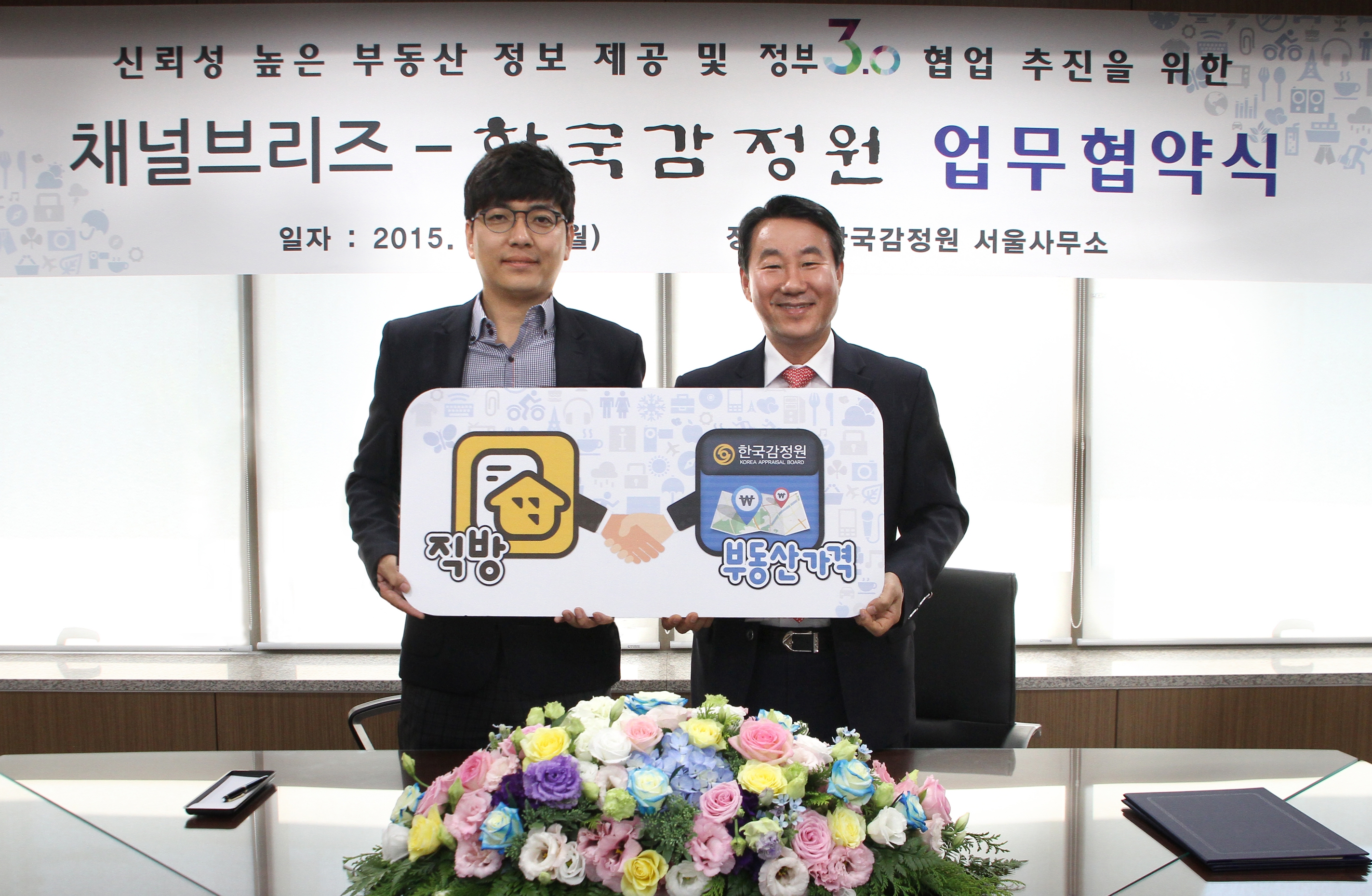 직방 서비스를 운영 중인 채널브리즈는 한국감정원과 한국감정원 서울사무소 3층 소회의실에서 ‘신뢰성 높은 부동산 정보 제공 및 정부3.0 협업 추진을 위한 업무 협약(MOU)’을 체결했다고 21일 밝혔다.