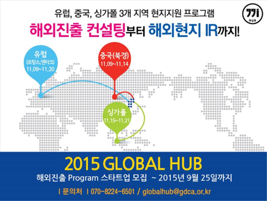 경기도는 도내 스타트업(초기 벤처기업)의 글로벌 진출을 위한 ‘글로벌 허브(GLOBAL HUB)’사업 참가자를 오는 9월 25일까지 모집한다고 17일 밝혔다. 스타트업의 글로벌 진출과 성공 모델을 발굴을 위한 사업으로, 콘텐츠 창업 시설 ‘판교 경기문화창조허브‘를 통해 추진하는 사업이다.
