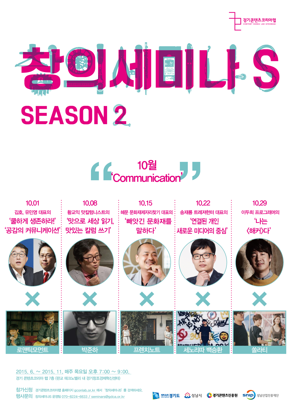 경기도 판교 소재 경기콘텐츠코리아랩에서 열리는 창의세미나S는 지친 직장인들과 창작자들을 위한 강연과 공연의 융합 프로그램으로, 문화 콘텐츠 분야의 전문가 강연과 인디 뮤지션들의 공연을 함께 즐길 수 있는 프로그램이다. 매 달 강연의 주제가 다채롭게 변주되는 이번 창의세미나S의 10월 주제는 ‘커뮤니케이션’으로 꾸며졌다.