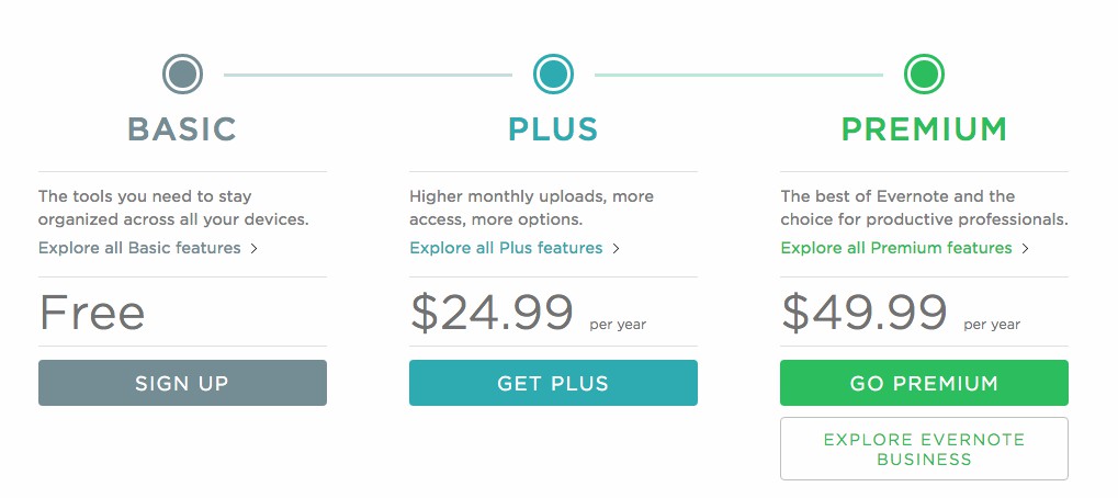 그런데 이렇게 성장하던 에버노트에 그림자가 드리워지기 시작한 것은 오래되지 않았습니다. 서비스의 특성상 무료 버전만 이용하더라도 충분히 쓸만하다는 것이 함정이었습니다. 에버노트는 무료 사용자와 프리미엄 사용자를 나누는 기준으로 데이터 전송 용량, 오프라인에서 노트를 편집하는 기능, 공유에 관련한 기능, 그리고 최근에는 이메일을 통한 데이터 수집 제한 등을 제안해 왔습니다.