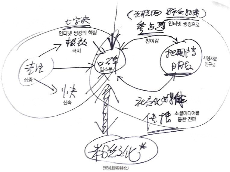 - 입소문 사건 확산: 초기 매니아들을 선별하여 참여감을 배양한 뒤, 상호교류를 통해 생산된 콘텐츠로 널리 전파, 입소문의 파급력 강화