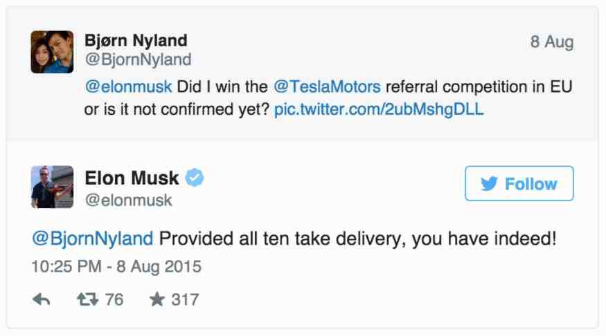 심지어 10대를 가장 먼저 판매하는 고객에게는 한정판 모델X를 선물로 주겠다고 선언했다. 그런데 놀랍게도 채 2주도 안되어 행운의 모델X 주인공이 나타났다. 그는 노르웨이에 사는 프로그래머이자 테슬라의 팬이었다. 그는 그동안 자신의 운전 경험을 유튜브를 통해 공유하면서 이미 많은 팬을 확보해왔는데 고객 추천 프로그램이 도입되자 유튜브를 통해 자신의 추천코드를 공유하였고 그 결과 모델X를 얻는 행운을 얻게 된 것이다.