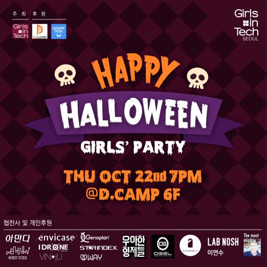 걸스인텍 코리아 (Girls In Tech, Korea)가 할로윈을 맞아 스타트업 종사자들을 위한 네트워킹 파티 ‘Halloween Girls’ Party’ 이벤트를 개최한다. 은행권청년창업재단 ‘디캠프’가 공식 후원하는 본 행사는 오는 10월 22일 저녁 7시 역삼동 D.camp에서 열린다.