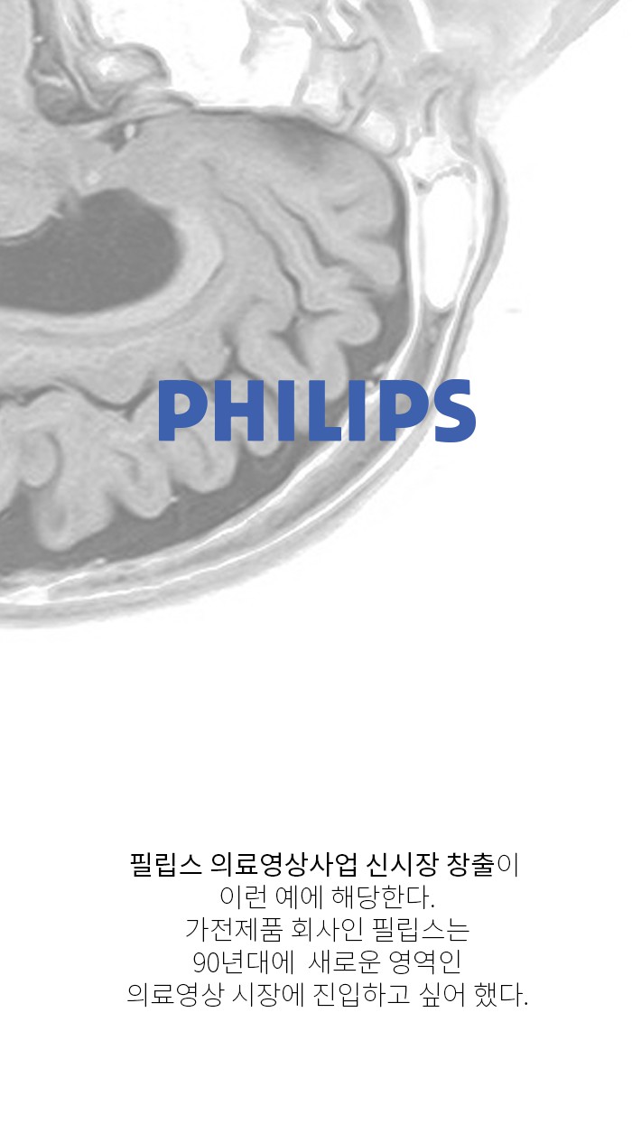 필립스의 사례가 대표적입니다. 가전제품 회사인 필립스는 90년대에 새로운 영역인 의료영상 시장에 진입하고 싶어 합니다.