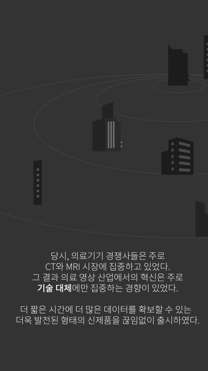 당시 의료기기 경쟁사들은 주로 CT와 MRI시장에 집중하고 있었는데, 그결과 의료 영상 산업에서의 혁신은 주로 기술대체에만 집중되는 경향이 있었습니다. 더 짧은 시간에 더 많은 데이터를 확보할 수 있는 더욱 발전된 형태의 신제품을 끊임없이 출시한 것이죠.