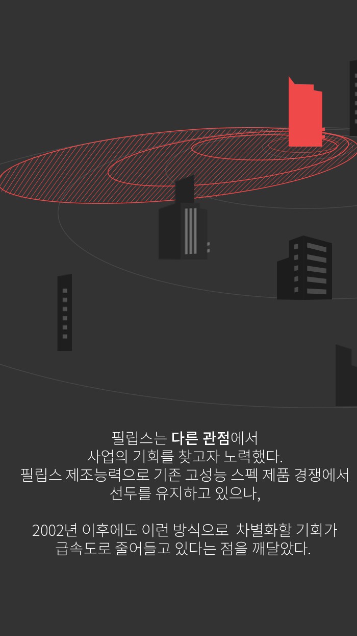 필립스는 다른 관점에서 사업의 기회를 찾고자 노력했습니다. 필립스 제조능력으로 기존 고성능 스펙 제품 경쟁에서 선두를 유지하고 있었으나, 2002년 이후에도 이런 방식으로 차별화할 기회가 급속도로 줄어들고 있다는 점을 깨달은 것이죠.