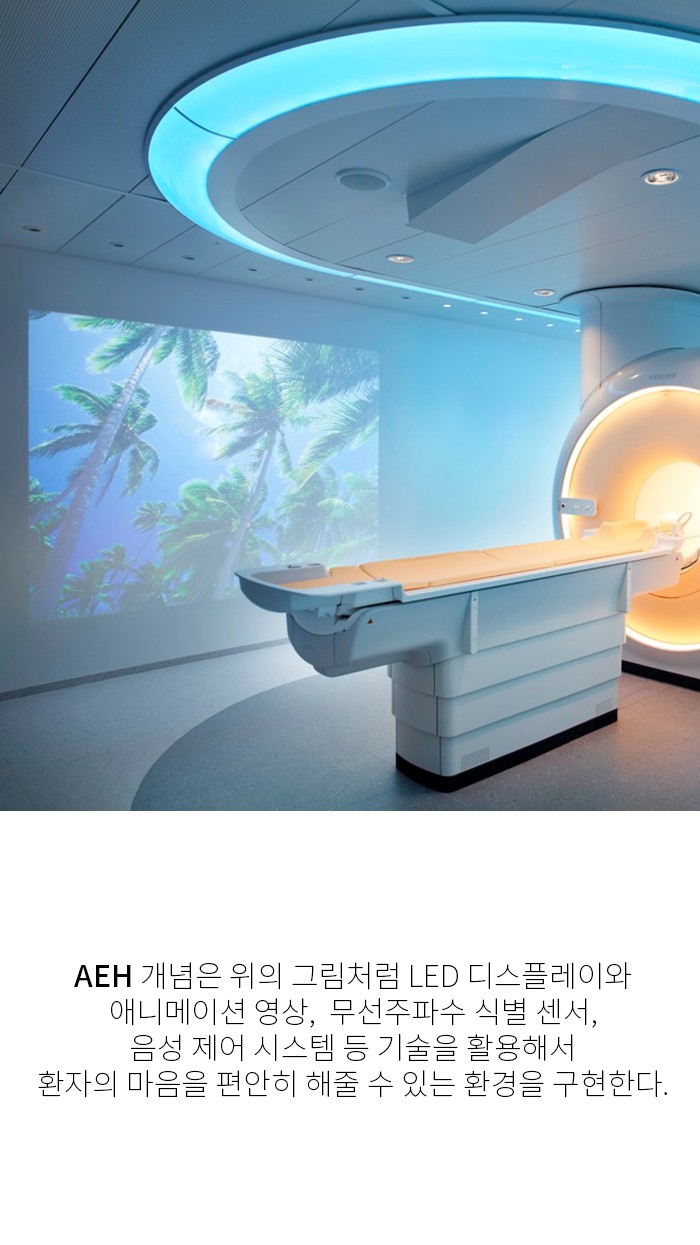 기존 MRI같은 의료 영상 촬영을 할 때 원통장비안에 들어간 환자들은 불안함에 몸을 움직이기 마련입니다. 이런 움직임 때문에 영상촬영의 질이 떨어지는 문제점이 있었죠. AEH 개념은 LED 디스플레이와 애니메이션 영상, 무선주파수 식별센서, 음성제어시스템등의 기술을 활용해서 환자의 마음을 편안히 해줄 수 있는 환경을 구현했습니다.