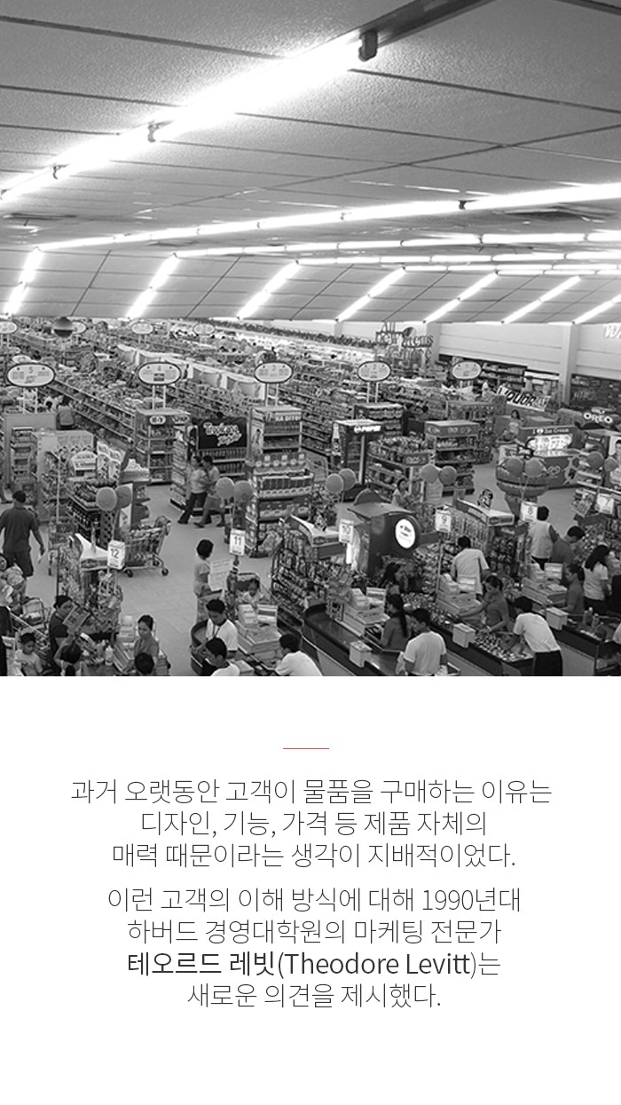 오랫동안 고객이 제품을 구매하는 이유는 디자인/기능/가격 등 제품자체의 매력때문이라는 인식이 지배적이었습니다. 1990년대 하버드 경영대학원의 마케팅전문가인 테오르드 레빗은 이에 반문을 제기하며 유명한 말을 남깁니다.
