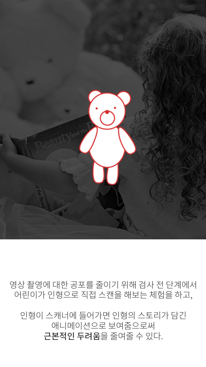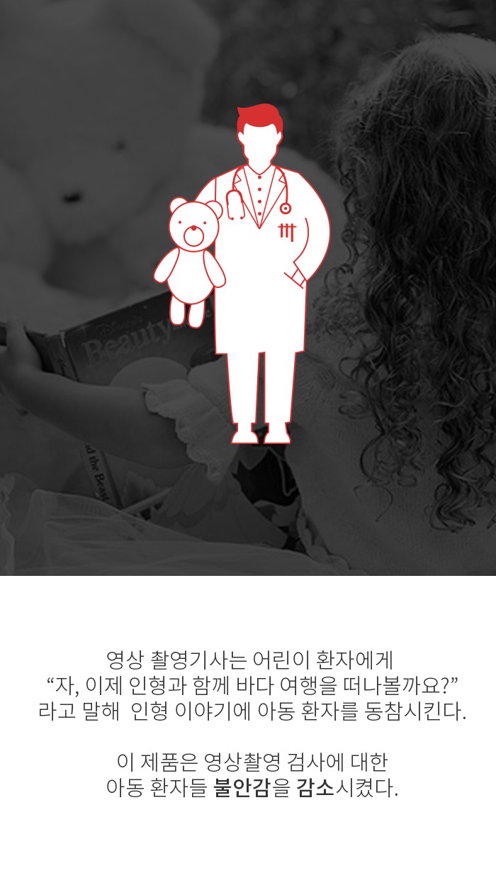 특히 어린이 환자의 이런 영상촬영은 공포 대상 중 하나였는데, AEH는 이를 줄이기 위해 검사전 단계에서 어린이가 인형으로 직접 스캔을 해보는 체험을 하고, 인형이 스캐너에 들어가면 인형의 스토리가 담긴 애니메이션을 보여줌으로써 근본적인 두려움을 줄여주는 데 집중했습니다. 그 결과 스캔시간을 15~20% 단축할 수 있었고, 마취 아동도 30~50% 줄였으며, 방사선에 노출되는 사례도 25~50%가 감소되었습니다.