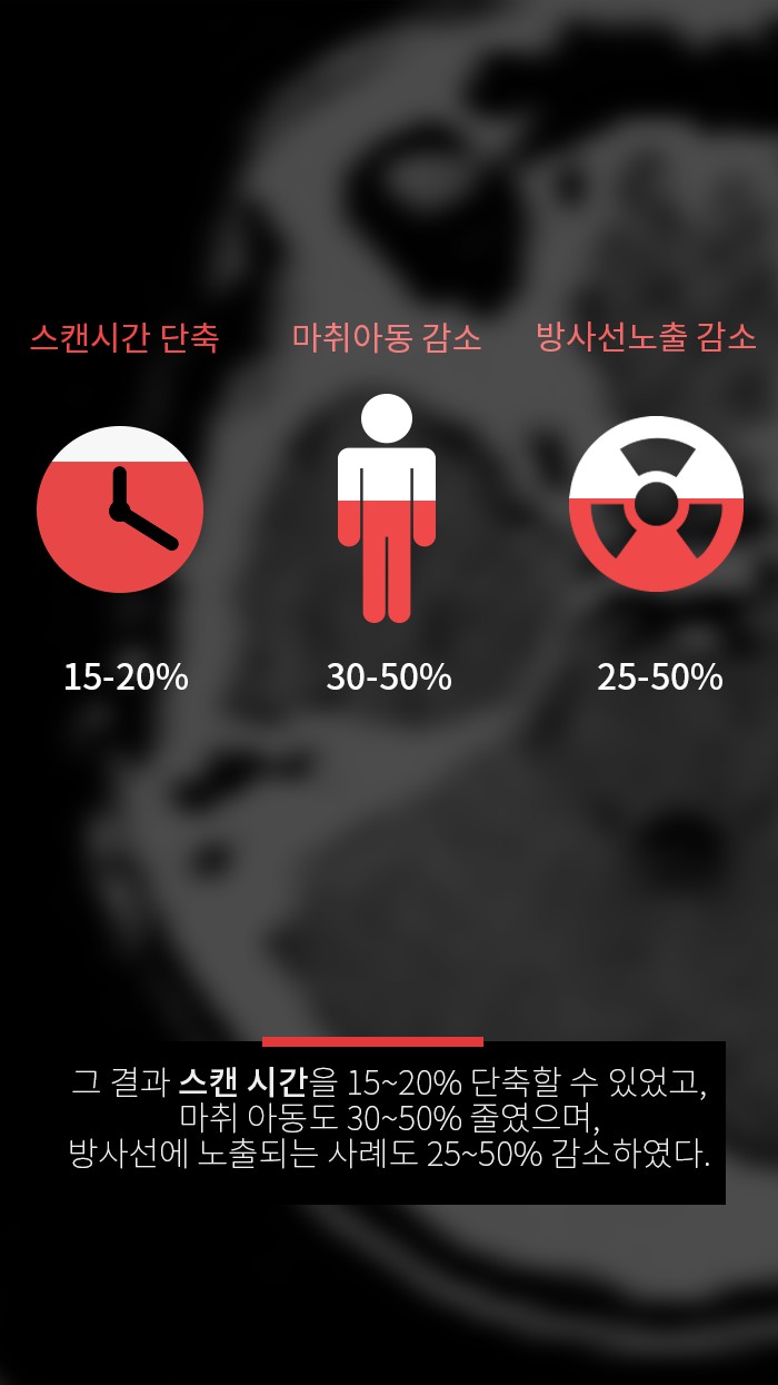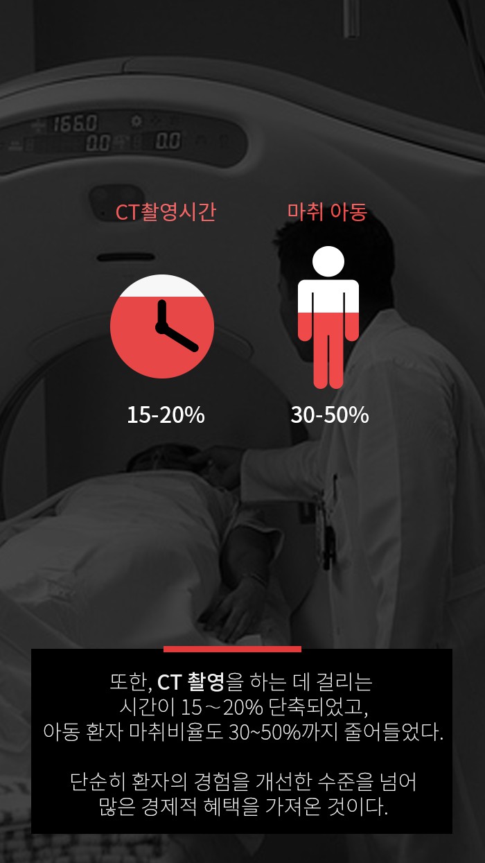 또한 CT촬영을 하는 데 걸리는 시간이 15~20% 단축되었고, 아동환자 마취비율도 30~50%까지 줄어들었습니다.